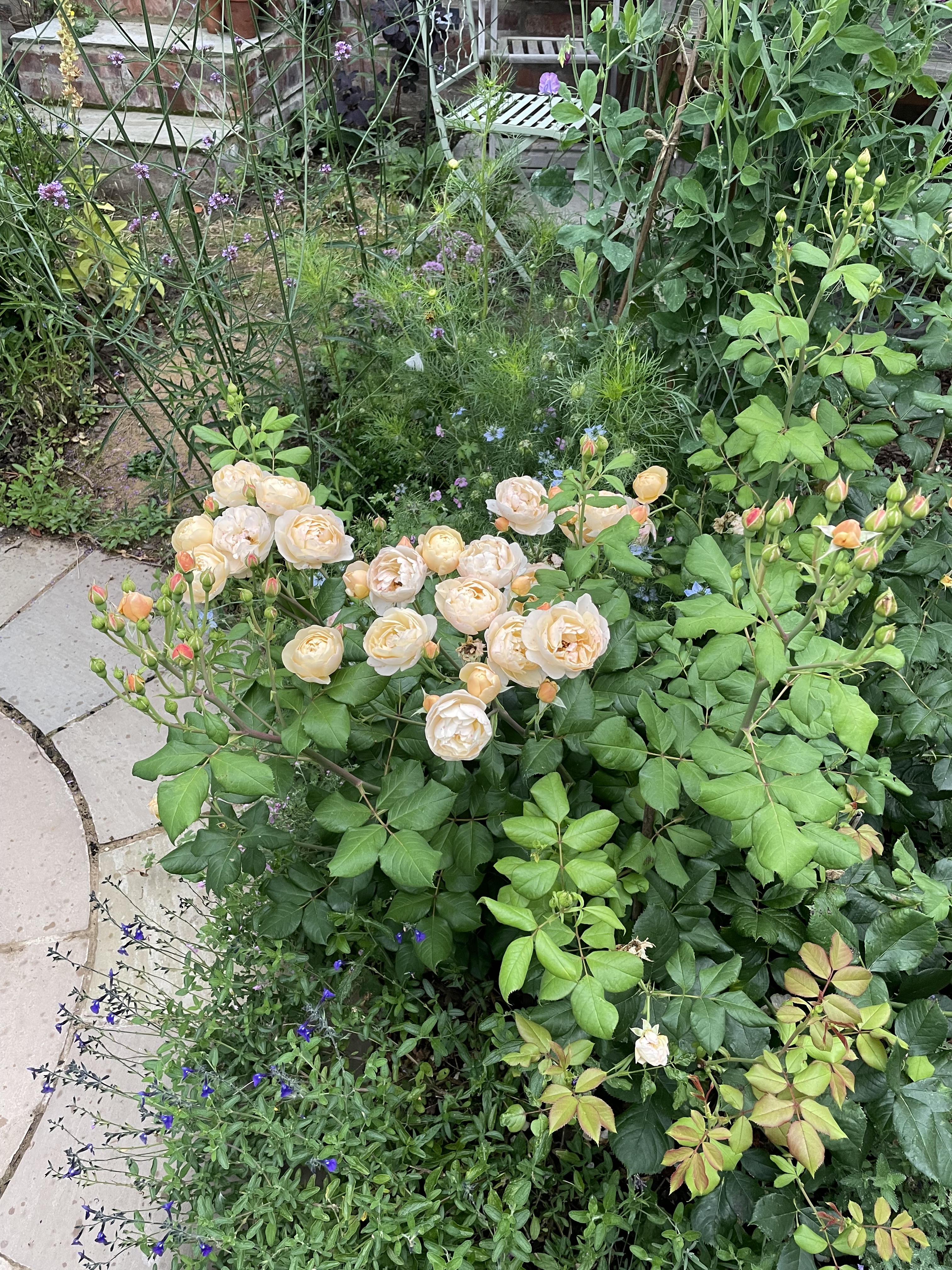 Client Garden: A south-facing courtyard garden with sandy soil. Beds were fully planted with a colourful mix of cottage garden and Mediterranean plants intended to attract wildlife and provide a long season of cut flowers.